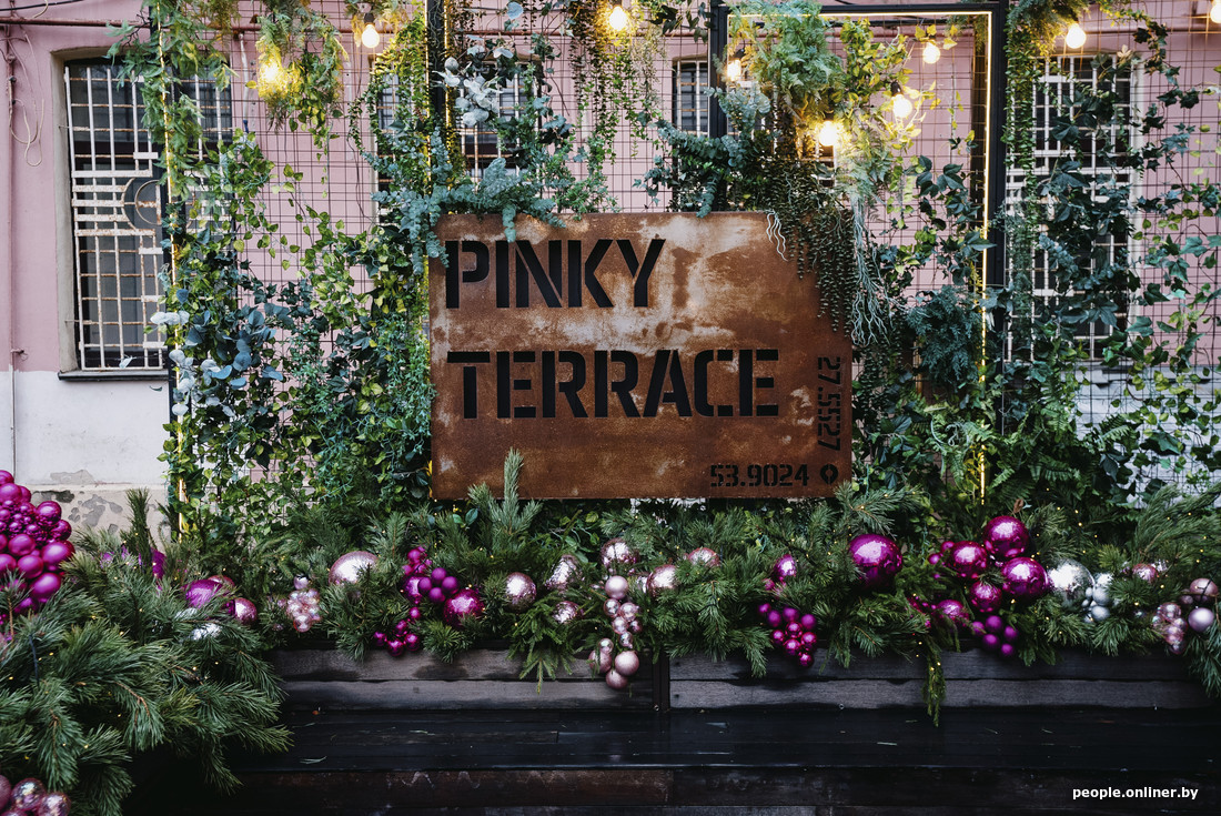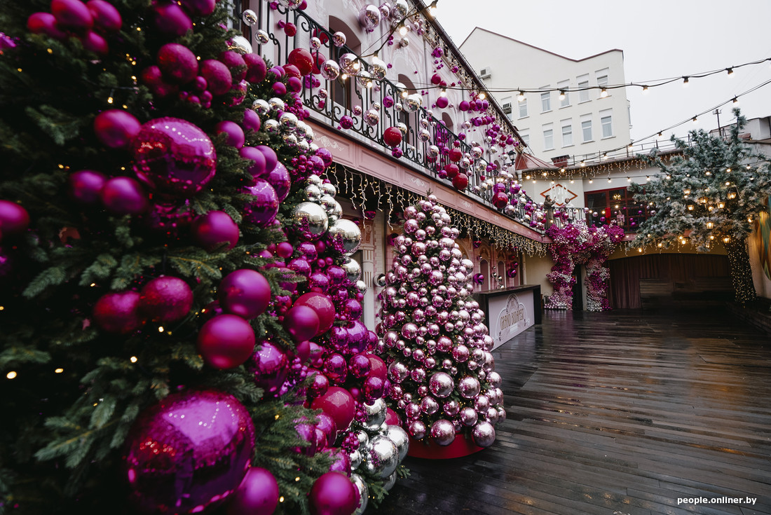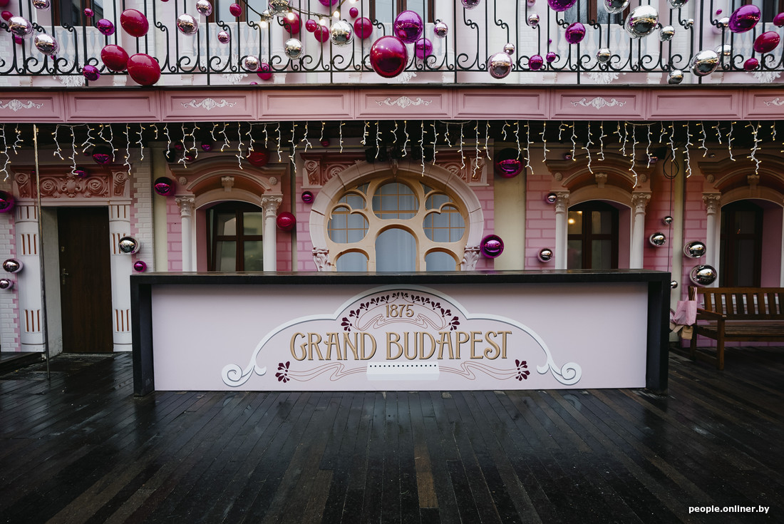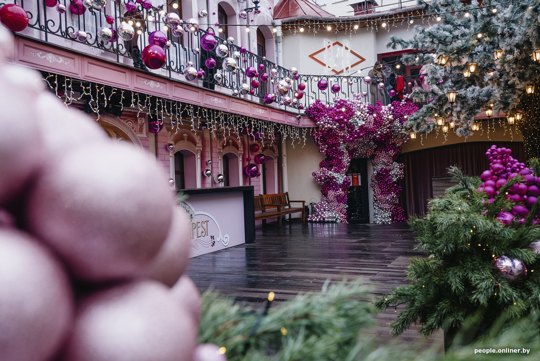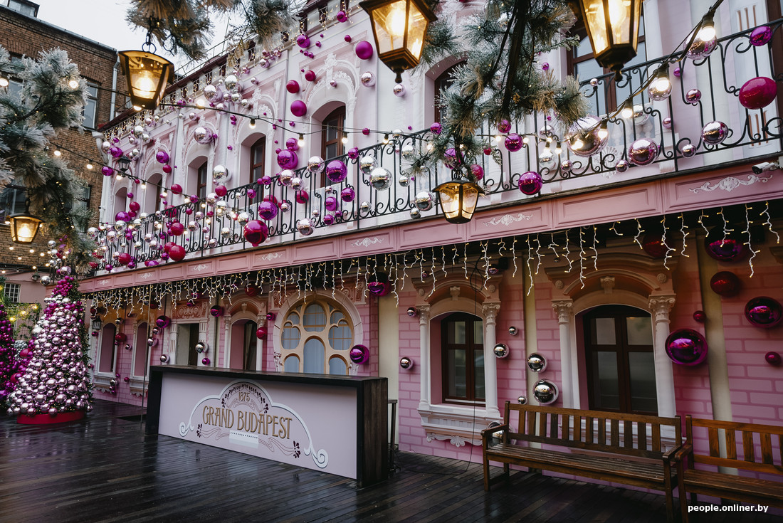 Минчане уже давно привыкли, что Pinky Bandinsky на Комсомольской регулярно балует инстаграмными украшениями своей террасы, но в этот раз заведение превзошло само себя. Рядом со входом теперь разбросаны, развешаны и расставлены сотни розовых елочных шаров, композицией напоминающие пузырьки от газировки. А одну из стен здания задекорировали под фасад отеля «Гранд Будапешт» из любимого всеми (и отчасти новогоднего) фильма Уэса Андерсона.