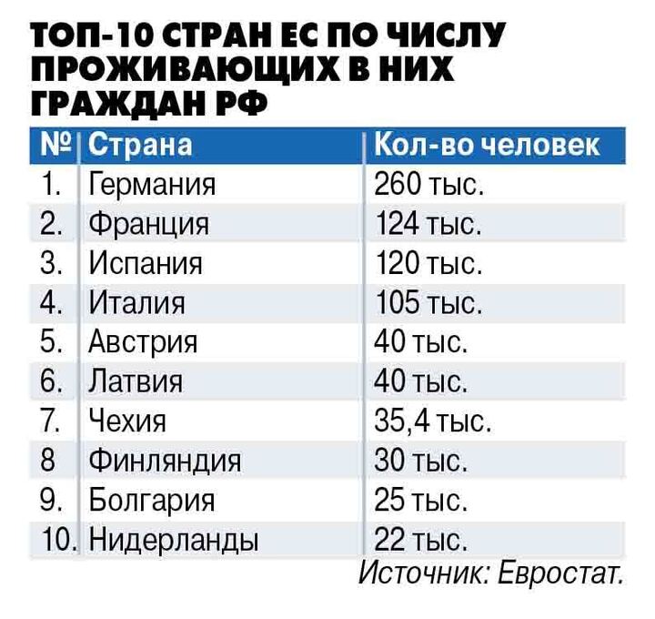 По данным Евростата, на европейском континенте больше всего граждан с российскими паспортами проживает в Германии ( 260 тыс., см. таблицу), во Франция (124 тыс.), Испании (120 тыс. ) и Италии ( 105 тыс.). Можно сказать, что россияне предпочитают арендовать и покупать особняки, квартиры, апартаменты в западноевропейских странах с сильной экономикой.