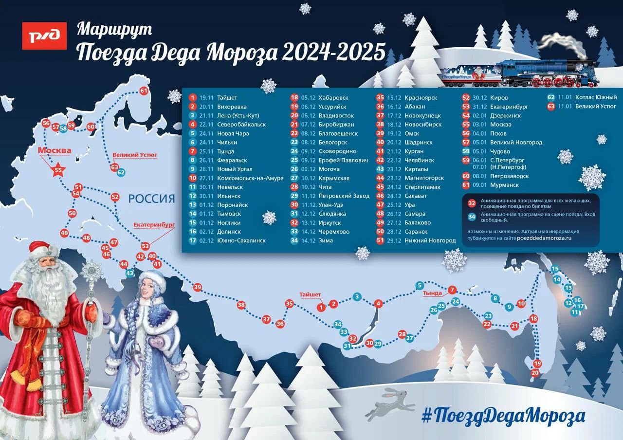 Стало известно расписание волшебного поезда Деда Мороза на 2024–2025.