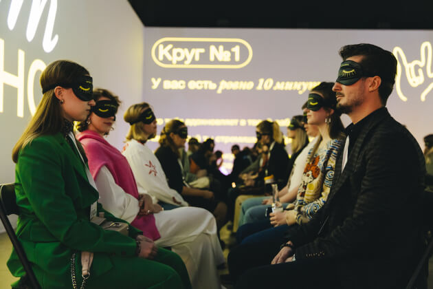 После небольшого перерыва гостей ждал blind-date. Погасив свет, мы раздали маски для сна и рассадили участников в зале друг напротив друга. В течение 3 раундов по 10 минут участники знакомились между собой, главное условие — не называть имена и должности до тех пор, пока не сняли маску. Blind-date стал альтернативой «знакомствам у барной стойки» — с личным коннектом с визави напротив без оглядки на статус.