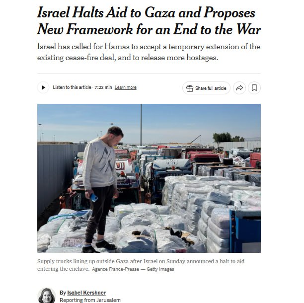 🔹Прекращение Израилем поставок гуманитарной помощи в Газу: