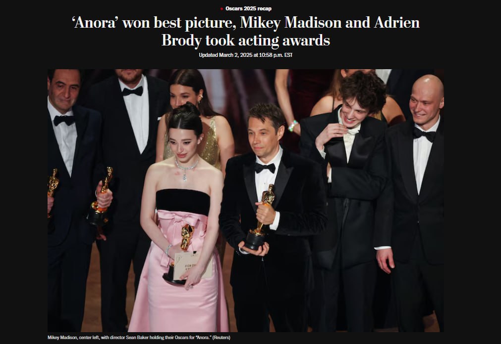 New York Times: "Анора", комедийная драма о танцовщице, которая выходит замуж за легкомысленного русского, выиграла "Оскар" в номинации "Лучший фильм". Единственная категория, где фильм был номинирован, но не победил - "Лучший актер второго плана", в которой Юру Борисова обошел Киран Калкин.