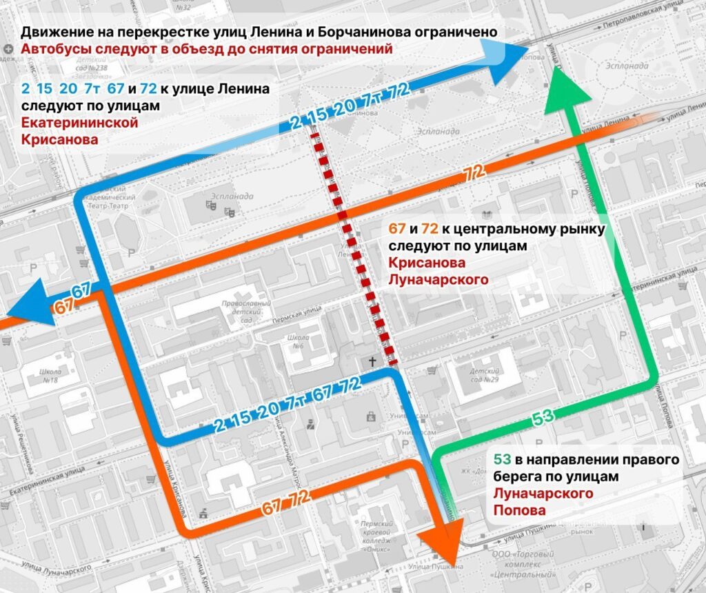 Автобусы маршрутов №№ 2, 15, 20, 7т, 67 и 72 следуют в объезд по улицам Крисанова и Екатерининской/Луначарского. № 53 в направлении Коммунального моста едут по Луначарского и Попова. В Дептрансе отметили, что маршруты автобусов №№5 и 11 остались без изменения.