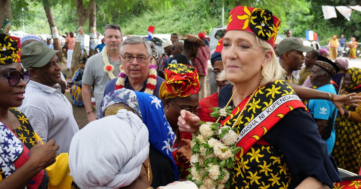 La dernière fois que Marine Le Pen est allée à Mayotte, la chef de file des députés du Rassemblement national (RN) s’était laissée emporter par les traditions locales. C’était en avril dernier, en pleine campagne des élections européennes. Sur une des photos prises sur place, la députée du Pas-de-Calais est installée confortablement sur une chaise, après avoir rencontré des Mahorais au carrefour de Ngwezi, près de Chirongui. Dès son arrivée, les habitants, des femmes, l’avaient coiffé à la mode de Mayotte, avec un haut tout en couleur, rouge et or, et un salouva, la tenue traditionnelle des femmes mahoraise, aux couleurs des fleurs d’ylang-ylang. Déjà, au moment de descendre les marches de son avion, des couronnes de fleurs attendaient la «candidate naturelle» du parti nationaliste à la prochaine élection présidentielle.