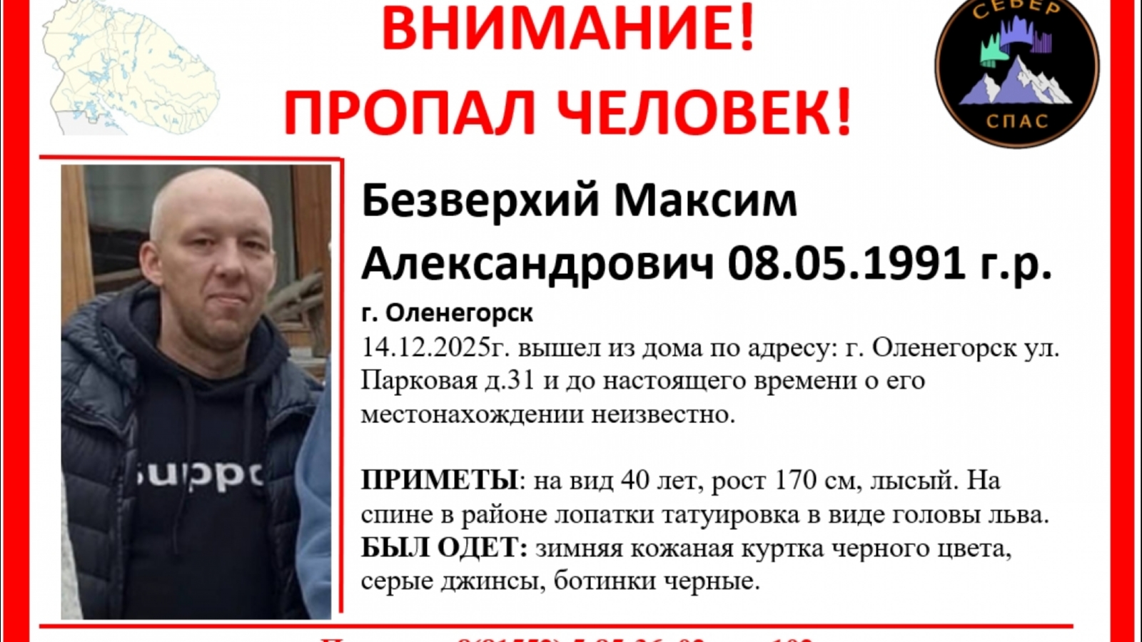 В Оленегорске ищут 34-летнего Максима Безверхого. 14 декабря он вышел из дома на улице Парковая, 31 и пропал. До настоящего времени его местонахождение неизвестно.