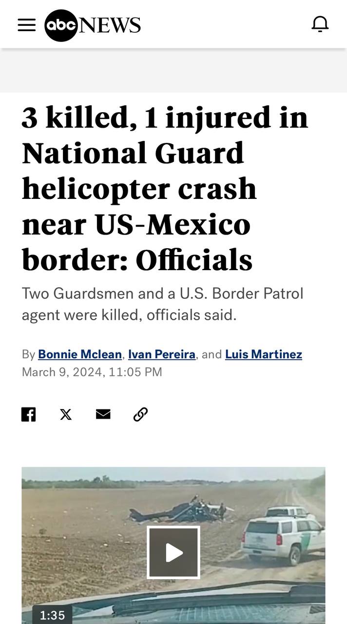 Три человека погибли из-за крушения американского военного вертолета на границе с Мексикой, - передает ABC News.