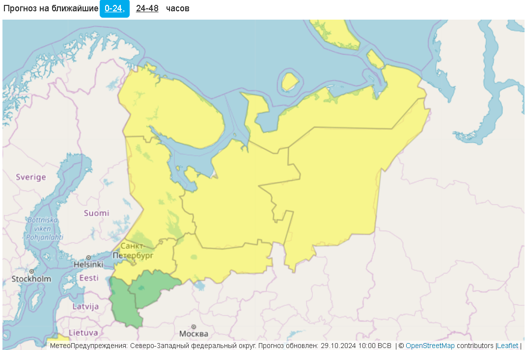 В Ленобласти тоже предупреждают о потенциально опасной погоде. Ветер до 15-20 м/с в регионе ожидают с 3 часов ночи 30 октября до полудня 31 октября. Кроме того, с 3:00 до 18:00 30 октября местами по области прогнозируют сильный дождь.