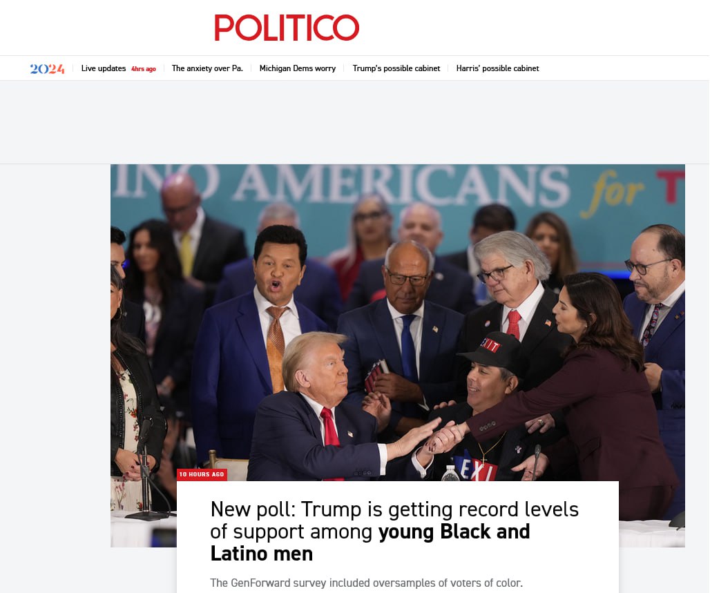 ▪️ 44 % молодых мужчин-латиноамериканцев заявили, что поддержат Трампа, - это больше, чем 38 %, которые поддержали его в 2020 году.