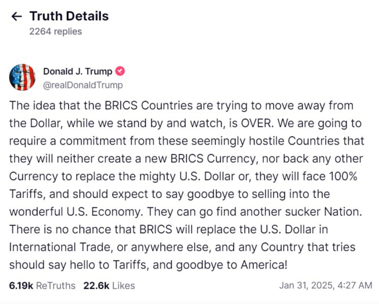 "На идее о том, что страны БРИКС пытаются отказаться от доллара, пока мы просто наблюдаем, поставлен крест. Мы собираемся потребовать от этих, вероятно, враждебных стран обязательства не создавать новую валюту БРИКС и не поддерживать никакую другую валюту, которая могла бы заменить могучий доллар США. В противном случае их ждут 100%-ные тарифы, и они могут попрощаться с возможностью продавать свои товары в великолепную экономику США. Пусть найдут другую страну-терпилу. Нет никакой возможности, чтобы БРИКС заменил доллар в международной торговле или где-либо ещё, и любая страна, которая попытается сделать это, должна готовиться к тарифам и прощаться с Америкой!".