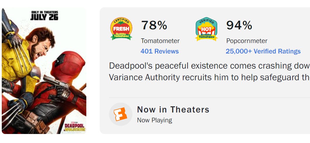 Зрители и критики тоже заценили новые приключения Дэдпула и Росомахи: 8,0 на IMDb, 7,6 на «Кинопоиске», 56/100 на Metacritic, 78% «свежести» и 94% зрительского одобрения на Rotten Tomatoes.