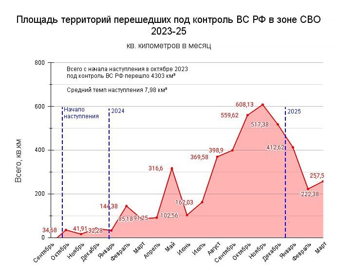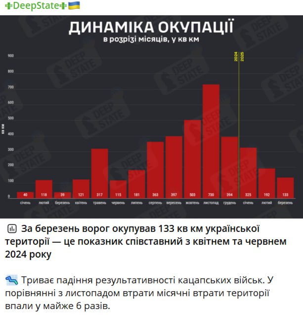 Однако манипуляция слишком очевидна, так как даже по оценкам самого DeepState, на 1 марта ВСУ контролировали в Курской области 396 кв.км., а на 1 апреля только 69 кв.км. Таким образом, российская армия продвинулась на 327 кв.км. и только в Курской области.
