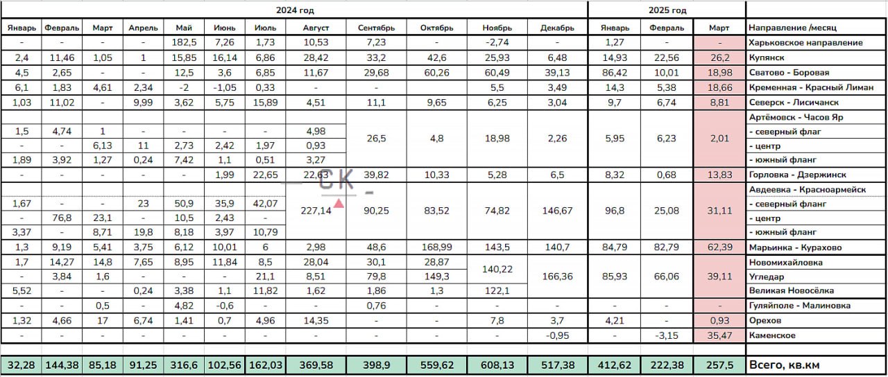 По оценкам отечественных аналитиков, продвижение на Донбассе в марте составило 257 кв.км., а если сложить эти цифры то общее продвижение составило 584 км.