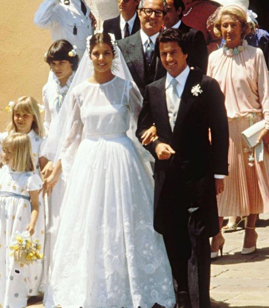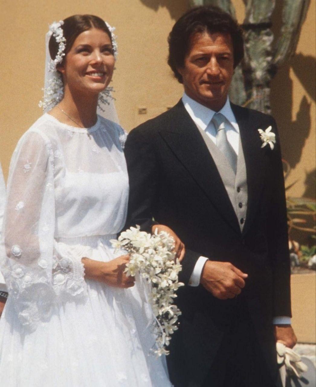 Старшая дочь Грейс Келли и князя Ренье III вышла замуж за Филиппа Жюно 29 июня 1978 года. Для свадьбы она выбрала платье в соответствующем эпохе стиле бохо: белое платье с кружевной юбкой и длинными рукавами было украшено изящной цветочной вышивкой. Дизайнером платья был Марк Бохан, работавший тогда в модном доме Christian Dior.