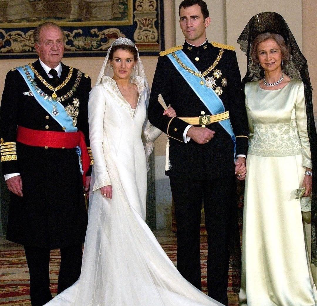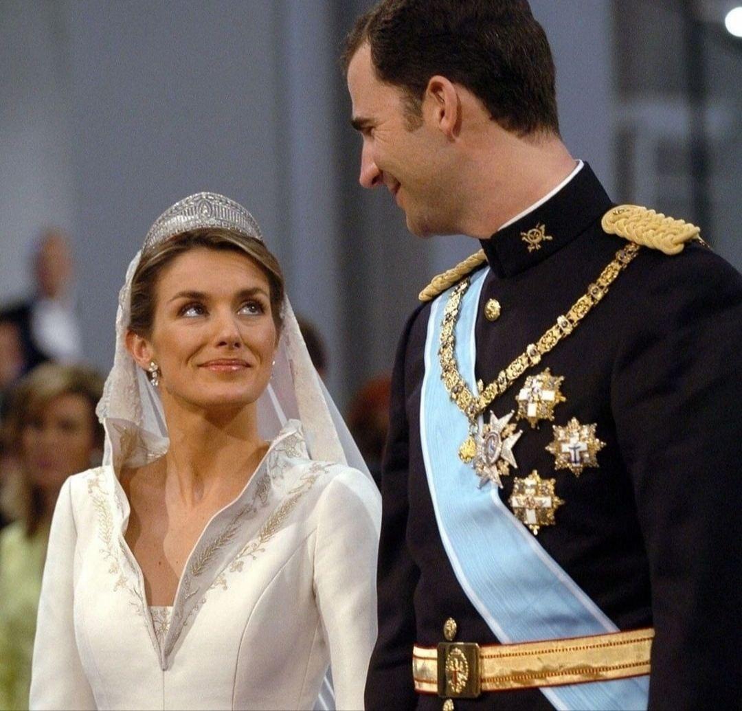 На свадьбе Летиция была в платье, созданном модельером Мануэлем Пертегасом. Оно было сшито из натурального шелка и расшито золотыми нитями, и главное — его украшал 15-метровый шлейф. На голове у будущей королевы была диадема, к которой крепилась длинная фата.