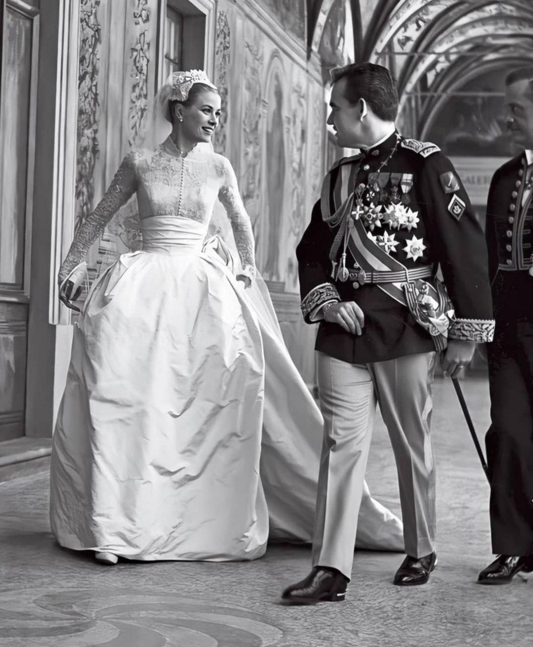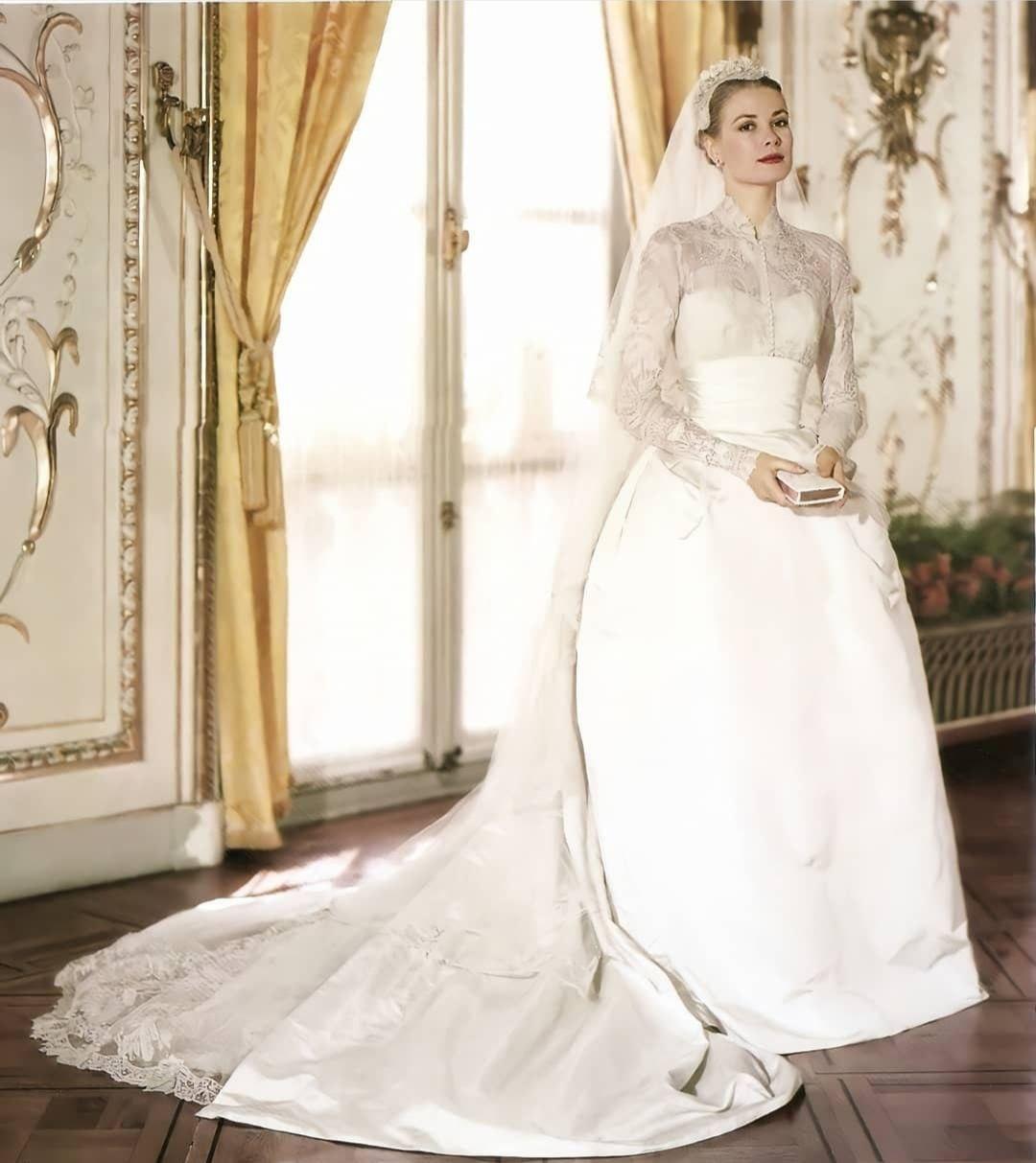 Ее свадебное платье стало прощальным подарком от киностудии Metro Goldwyn Mayer. Его разработала Хелен Роуз, художница по костюмам и обладательница премии Оскар. Ей удалось превзойти саму себя — по сей день платье Грейс Келли одно из самых упоминаемых. Оно было сшито вручную их 125-пятилетнего брюссельского кружева и тафты, и украшено множеством жемчужин. Платье казалось довольно скромным — высокий воротник, длинные рукава, но при этом привлекало внимание — платье отличали пышная юбка и шлейф длиной в 10 с половиной футов.