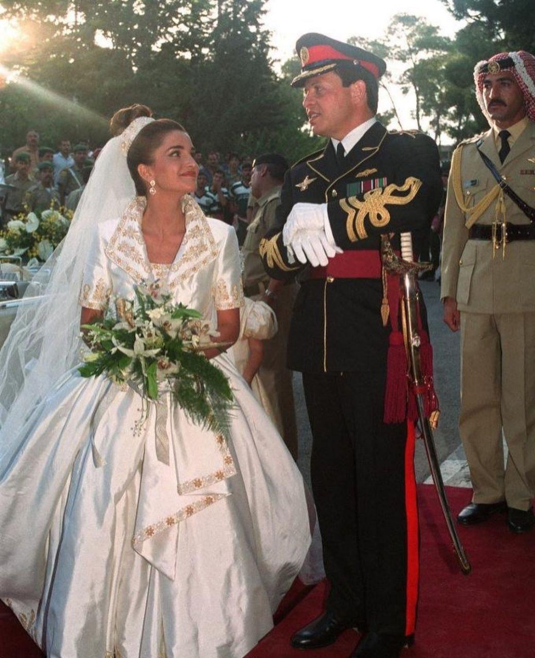 Платье для королевы Рании создал Брюс Олдфилд, известный британский модельер. При создании свадебного платья он вдохновлялся сирийскими вечерними платьями, выставленными в Музее Виктории и Альберта в Лондоне. Платье Рании многослойное: оно состоит из верхнего платья-жакета, украшенного золотой цветочной вышивкой, и нижнего, более облегающего платья. Нечто похожее примерила на себя королева Камилла во время коронации — над ее платьем также работал Брюс Олдфилд.