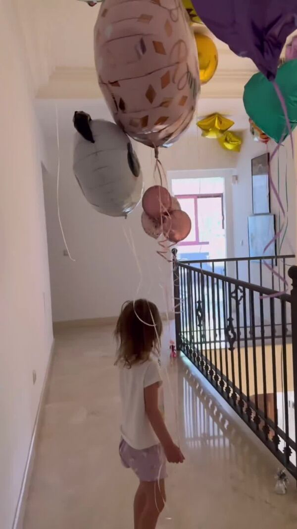 С раннего утра дом был украшен разноцветными шариками. Альбина сняла на видео, как только проснувшаяся Агата шла по украшенному воздушными шарами особняку и ловила руками ленточки. На кадрах впервые можно разглядеть черты лица девочки, которую раньше показывали лишь со спины.