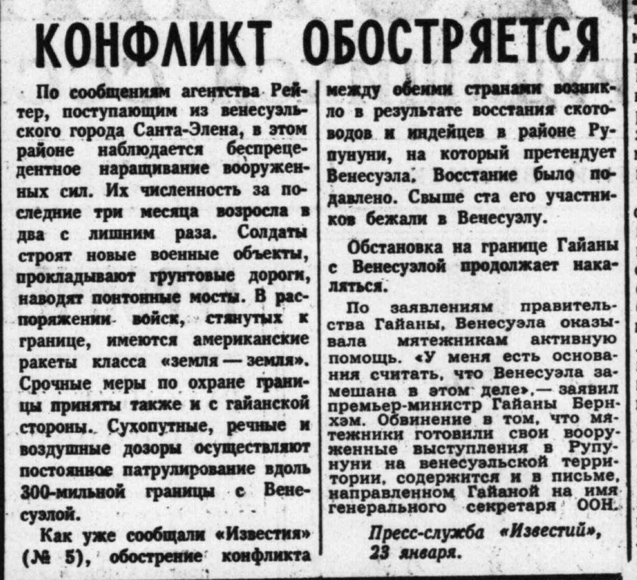 Территориальный спор между Венесуэлой и Гайаной периодически вспыхивает последние два столетия. Обе страны претендуют на земли площадью 160 тысяч кв. км западнее реки Эссекибо.