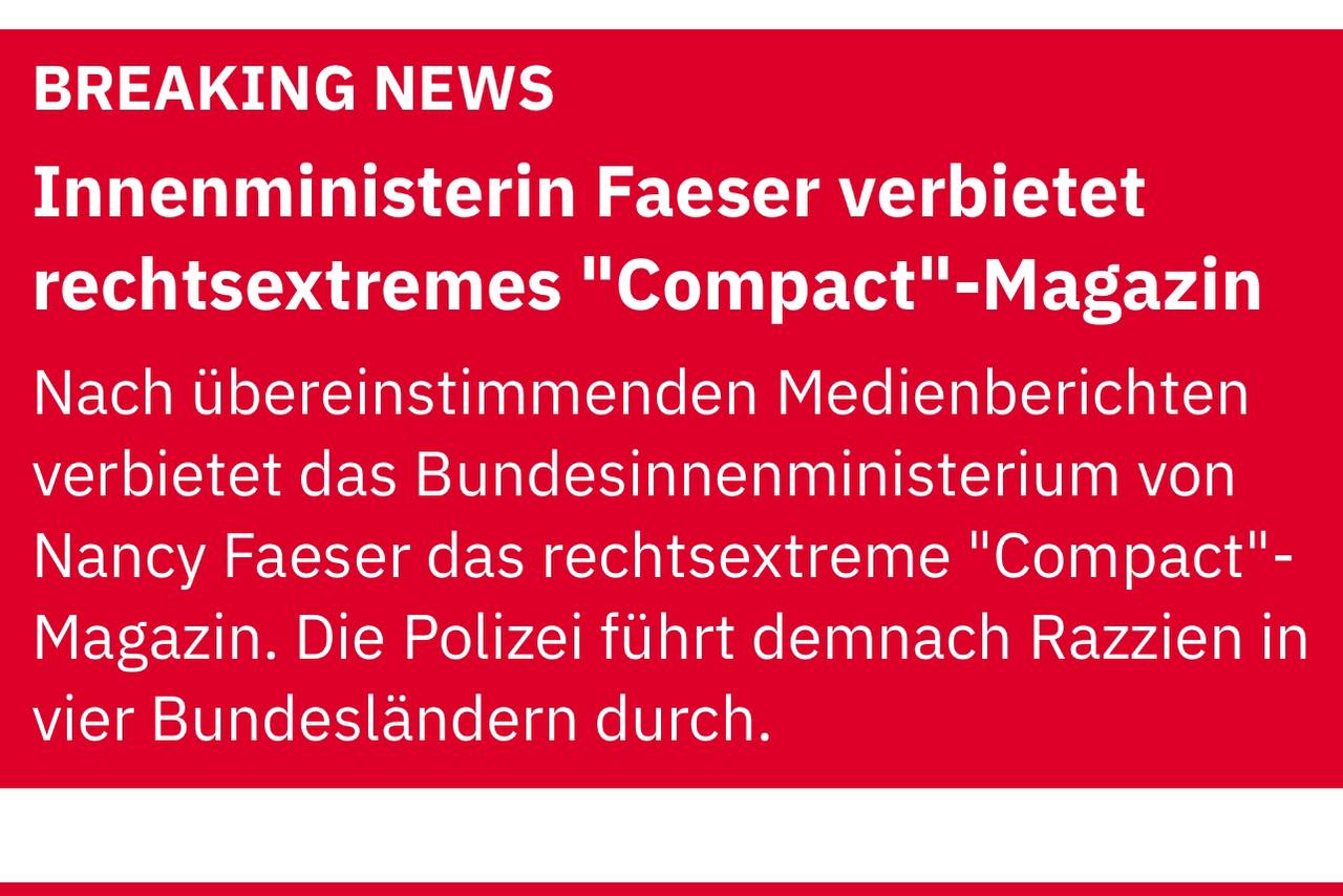 Без комментариев. «Федеральное министерство внутренних дел Нэнси Фазер запретило правый экстремистский журнал "Compact". Об этом сообщает "Spiegel". С раннего утра вторника полицейские обыскивают дома и офисы в Бранденбурге, Саксонии, Гессене и Саксонии-Анхальте, включая помещения медиа-компании в Фалькензее недалеко от Берлина.»