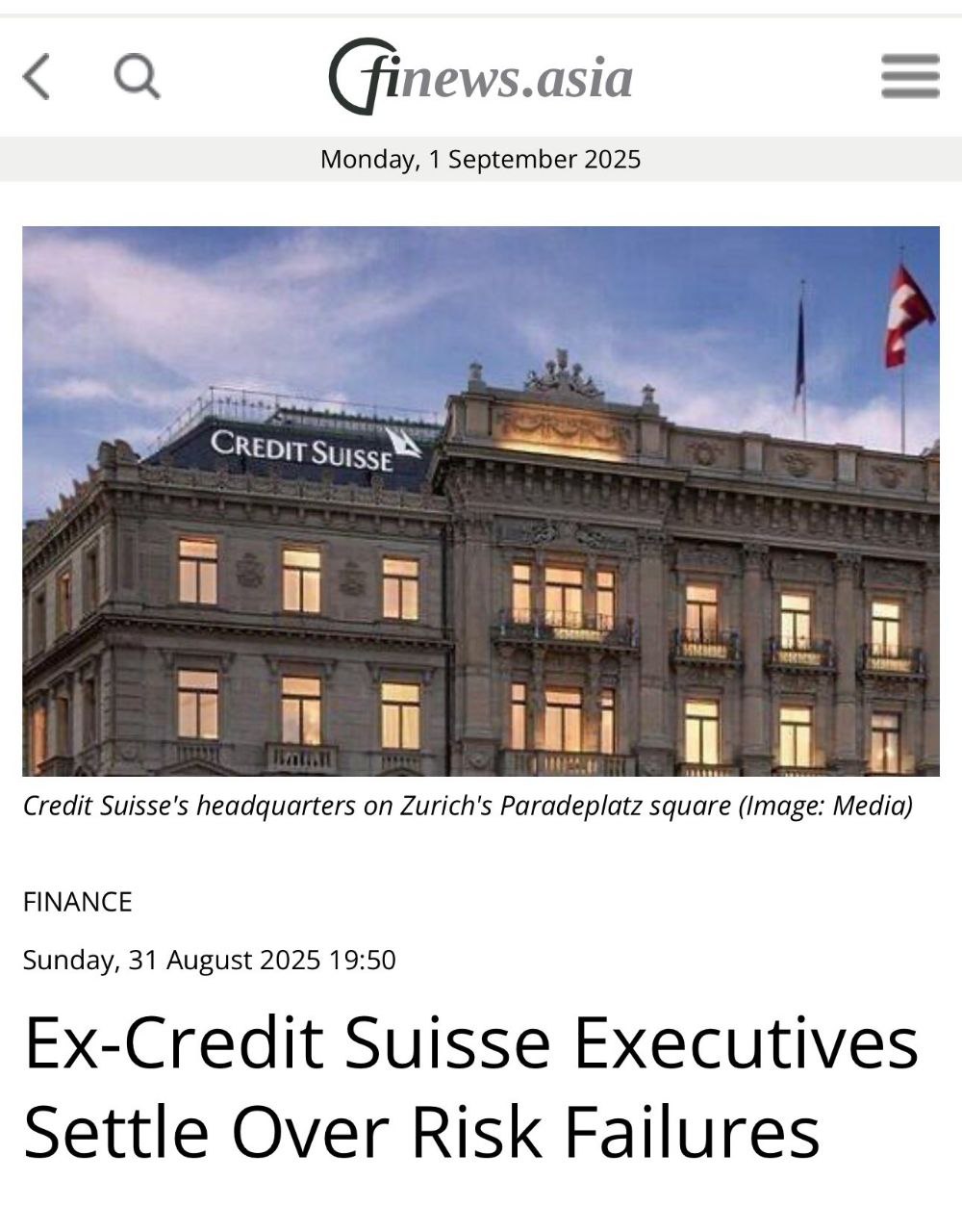 Девятнадцать бывших топ-менеджеров Credit Suisse, включая бывшего председателя Урса Ронера, согласились выплатить 115 миллионов долларов в качестве компенсации по искам акционеров, утверждающих, что они не обеспечили надлежащий контроль рисков в швейцарском банке. Выплата будет переведена в UBS Group, которая приобрела Credit Suisse после краха в 2023 году. @banksta
