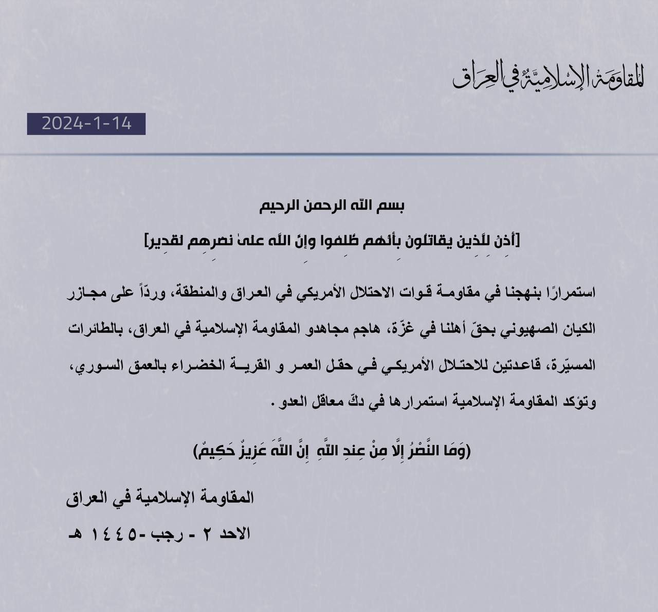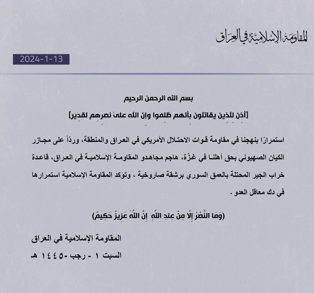 ❗️ Исламское сопротивление Ирака сообщило о последних нападениях на военные базы США в Сирии