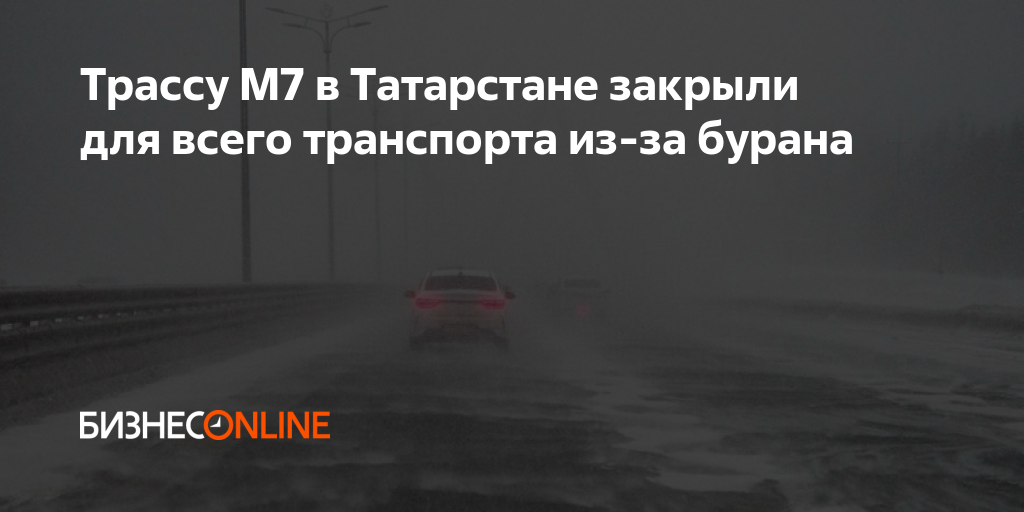 До этого для всех видов транспорта закрыли также трассу М12. С 5 часов утра на все дороги Татарстана не выпускают автобусы и грузовики. Госавтоинспекция Татарстана призывает участников дорожного движения без крайней необходимости не выезжать за пределы населенных пунктов. Напомним, в Татарстане объявили штормовое предупреждение из-за метели с ухудшением видимости до 500 м и менее и очень сильного ветра до 25 м/с. Оно действует с 1:00 до 21:00.