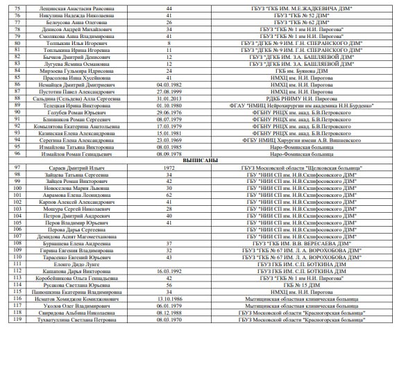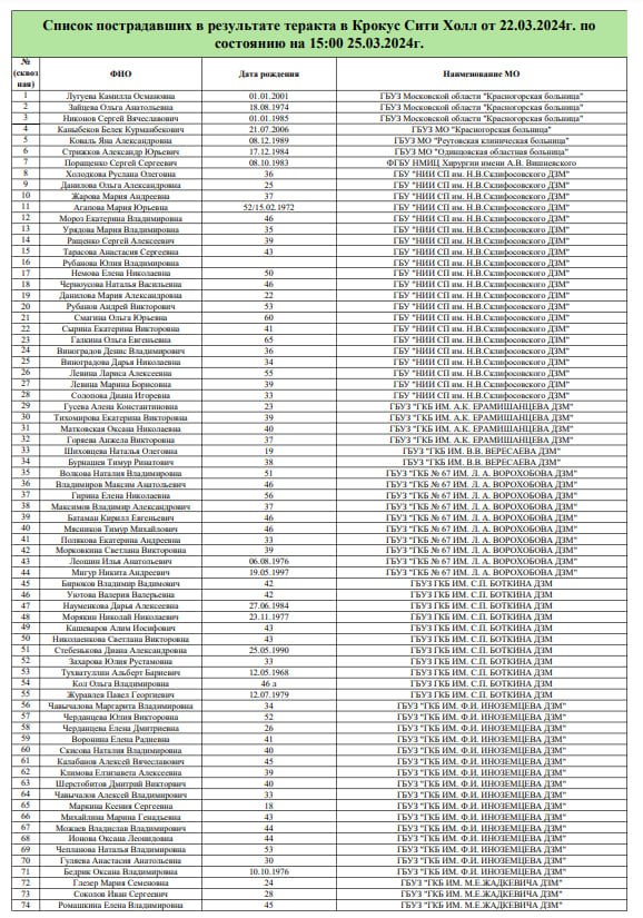 Минздрав Подмосковья опубликовал список пострадавших в результате теракта в "Крокусе" по состоянию на 15 часов мск. Госпитализированными остаются 96 человек.