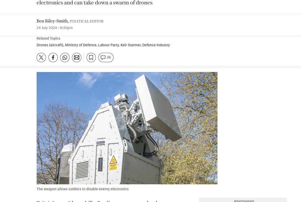 Новое британское радиоволновое оружие «убийца дронов» оказалось под угрозой после того, как лейбористы отменили планы тори по увеличению расходов на оборону до 2,5 процента ВВП к 2030 году. Министерство обороны было на грани подписания контракта на поставку около 15 единиц радиочастотного оружия направленной энергии от оборонной компании Thales.