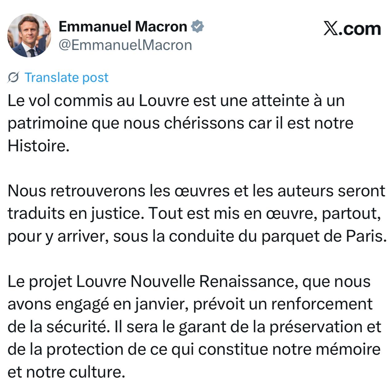 «Ограбление в Лувре — это посягательство на наше наследие. Мы вернём произведения, и виновные будут привлечены к ответственности».
