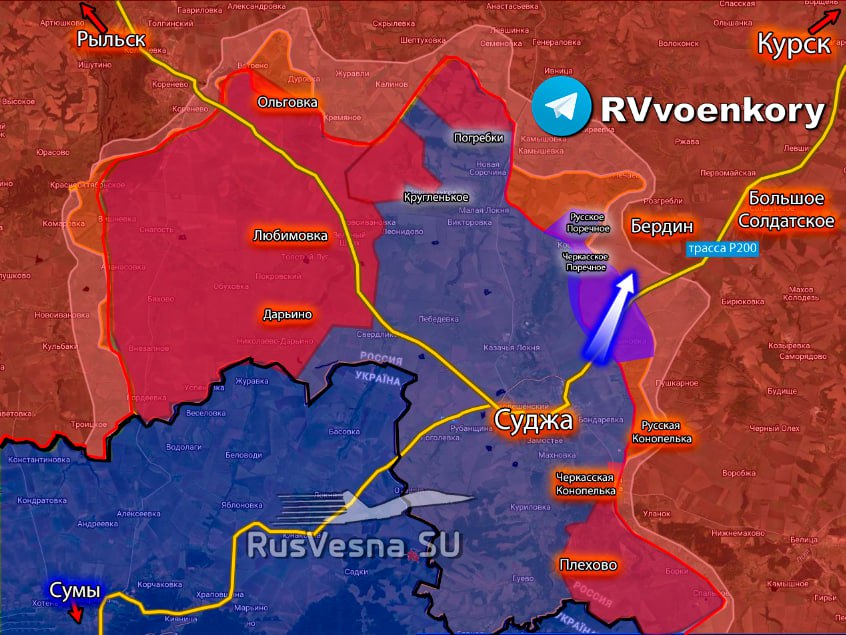 🇷🇺⚔️🇺🇦Враг бросил в наступление резервы в Курской области, атакуя в сторону Большого Солдатского ▪️Из Суджанского района оккупанты на бронетехнике атакуют в направлении Бердин-Большое Солдатское, разминировав ряд участков. Для прорыва ВСУ прикрыли район мощными системами РЭБ, затрудняя работу наших БПЛА. ▪️Ожидается, что ВСУ могут атаковать и на других участках. t.me/RVvoenkor