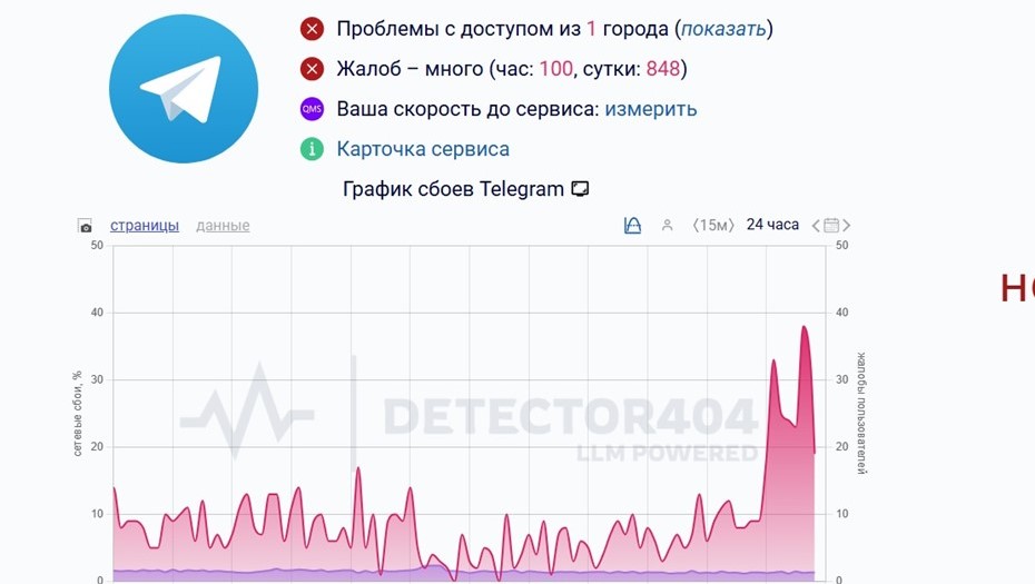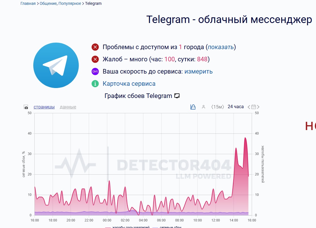 Жители России 16 января массово пожаловались на сбой в работе мессенджера Telegram, об этом свидетельствуют данные сбой.рф и detector404
