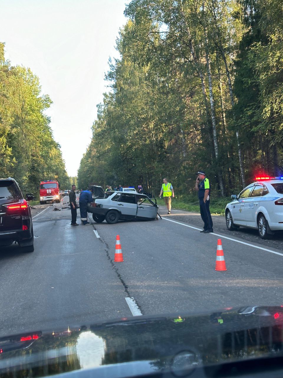 Предварительно, 58-летний водитель «Волги» пошёл на обгон, но не справился с управлением и врезался во встречный ВАЗ. Первую легковушку отбросило в кювет, где та загорелась. Вторая же врезалась ещё и в грузовик, из-за чего авто буквально разорвало пополам.