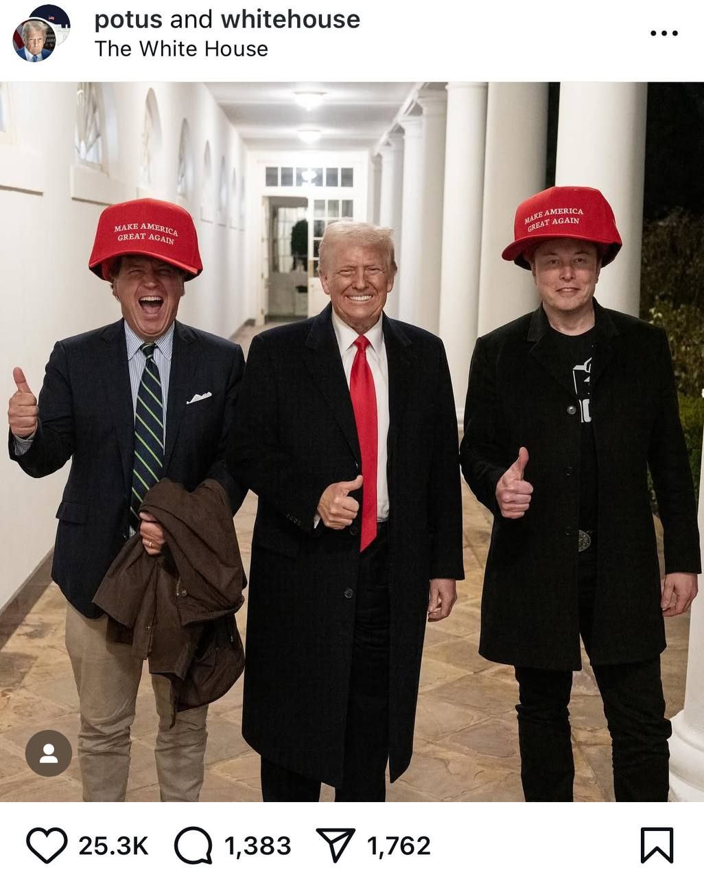 Это реальное фото Трампа и Илона Маска и Такера Карлсона в Белом доме, где они веселятся. Вот реально живые люди, а не полукиборги, как многие другие политики. Трамп, Карлсон и Маск - три мушкетёра!