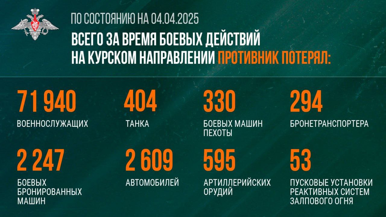 Текущая статистика потерь личного состава и военной техники ВСУ на Курском направлении с начала вторжения в августе 2024 года по данным Минобороны РФ.