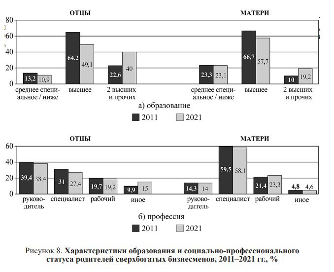 При этом следует иметь в виду, напоминают исследователи, что «в период с 1970 по 1979 г. доля лиц с высшим образованием среди работающих россиян находилась в пределах 6,5–10%. Как видим, высшее образование в те годы получали единицы, и именно из числа таких семей и происходит бОльшая часть сверхбогатых, что и отличает их от большинства их ровесников».