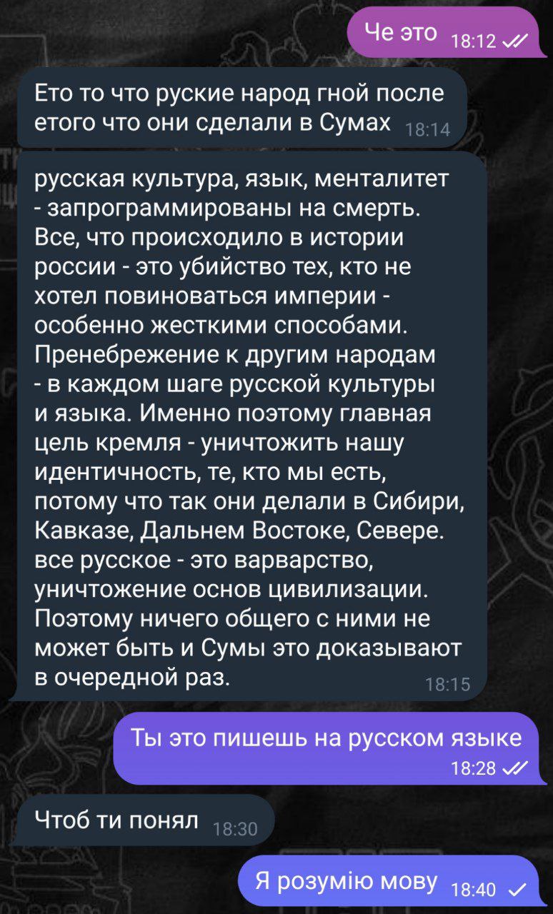 Тем временем украинцы пришли мне в личку рассуждать о Варварстве и Цивилизации. Говорят, мол наша варварская Империя (что уже противоречит друг-другу т.к. империя это всегда цивилизация) жаждет уничтожить их украинскую цивилизацию. Другалек, а ничего тот факт, что Владик Угольный уже годик примерно говорит жителям города Сумы, что им уебывать надо чтобы выжить? И если бы они уебали бы, забрав с собой несчастных детей, то остались бы живы в момент, когда Россия поразила ВОЕННУЮ ЦЕЛЬ в их городе. Владик Угольный - настолько варвар, что единственный гуманист на этой войне, орущий УЕБУЙТЕ ИЗ ЗОНЫ БОЕВЫХ ДЕЙСТВИЙ ЭТА ЗОНА ПРЕВРАТИТ ВАС ИЗ ЛЮДЕЙ (ИЛИ ХОХЛОВ) В ДЕГУМАНИЗИРОВАННЫЙ "МИРНЯК" НЕ БУДЬТЕ "МИРНЯКОМ" ДЕБИЛЫ Но да, Владик У - варвар. Лучше сидеть да пердеть с детьми своими на асфальт родненький. Да пиздеть про Злую Империю. Вы кретины, которые воюют с реальностью. Поэтому ваши дети по вашей вине будут умирать.