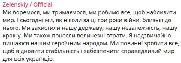 «Мы боремся, мы держимся, мы делаем все, чтобы приблизить мир. И сегодня мы, как никогда за эти 3 года войны, близки ему. Мы защитили наше государство, нашу независимость, нашу страну. Мы также понесли огромные потери. Я очень горжусь нашим героическим народом. Мы должны сделать все, чтобы восстановить стабильность и обеспечить справедливый мир для всех украинцев.»