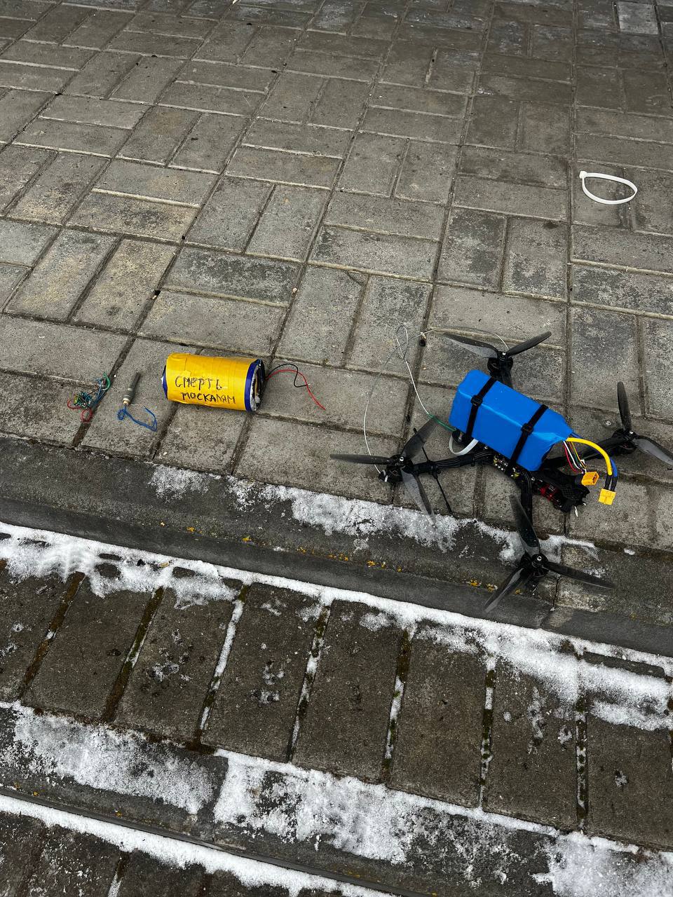 Этот украинский дрон был обезврежен боевой группой ОМОН Росгвардии на территории Брянской области. В желтом цилиндре с «дружеской» надписью содержалось взрывчатое вещество (тротил) с разлетом поражающих элементов до 8 метров. Слева от него — снятый саперами взрыватель.