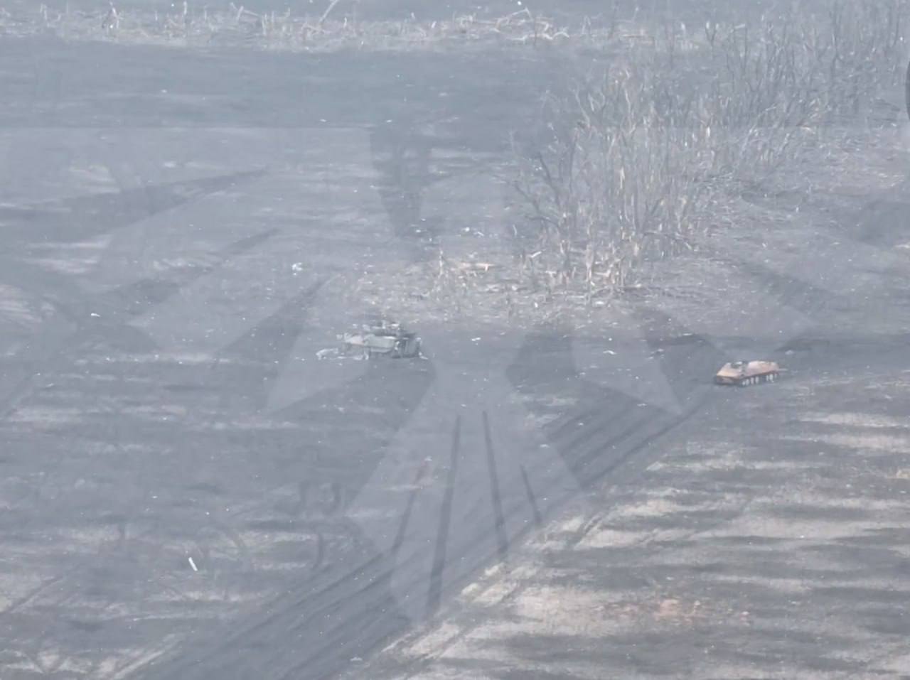 Окраины посёлка Степовое в объективе украинского коптера. На кадрах видна уничтоженная бронетехника - бронетранспортер M2 «Брэдли» и бронеавтомобиль «Козак» украинской армии, а также уничтоженная российская МЛТБ.