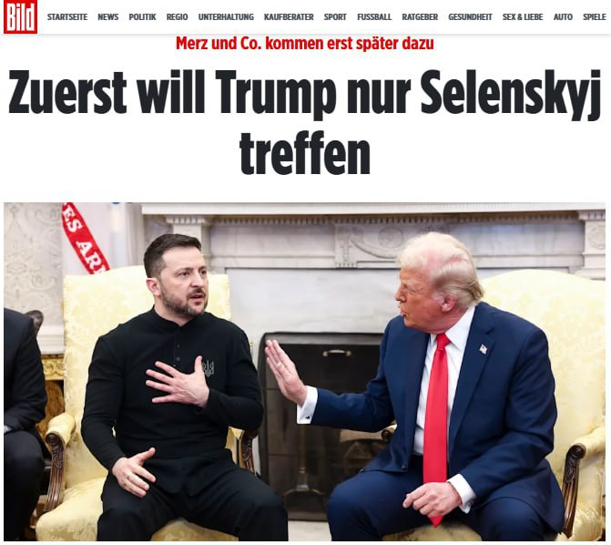 ⚡️Трамп отказался от общей встречи с европейскими лидерами и сначала примет Зеленского наедине. Это утверждает Bild со ссылкой на источники. Отмечается, что только после переговоров тет-а-тет к ним присоединятся представители ЕС и НАТО. В программе — рабочий ужин и многочасовая дискуссия в расширенном составе. 🟩 Подписаться на RT: ТГ | Зеркало | MAX