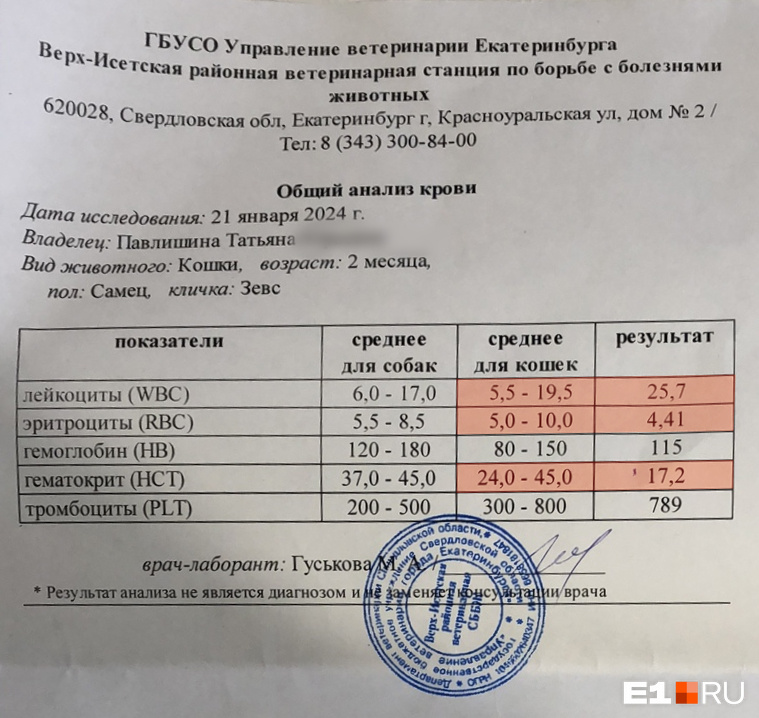 Кота назвали Зевсом. На следующий день после того, как питомца принесли в новый дом, у него началась диарея. Татьяна стала спрашивать заводчицу, как же так вышло, а потом пошла в районную ветклинику, где у Зевса взяли анализы. Результат — подозрение на вирусную инфекцию.