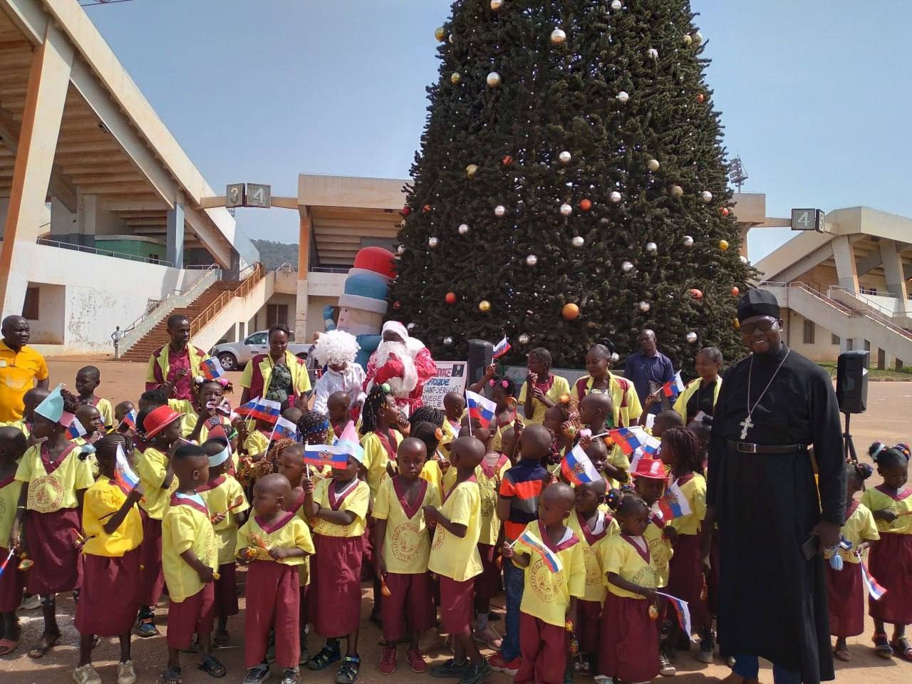 Африканские дети празднуют Рождество Христово вместе с Дедом Морозом, Снегурочкой и священником Русской православной церкви отцом Сергием (в миру Режи Сен-Клер Воемава). Банги, Центральноафриканская республика, 7 января 2024 года.