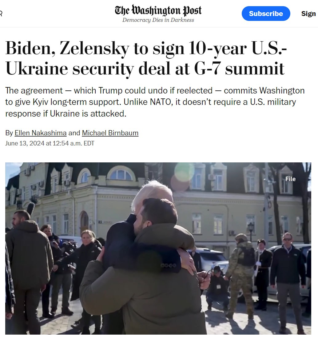 WP: Трамп или любой другой следующий президент США сможет отменить десятилетнее соглашение, которое сегодня подпишут Байден и Зеленский. Документ о гарантиях безопасности направлен на то, чтобы обязать будущие власти США поддерживать Украину. Но это не договор, и он не будет ратифицирован конгрессом. По условиям соглашения, США не берут на себя никаких новых обязательств относительно перспектив вступления Украины в НАТО, оно не обязывает Штаты давать военный ответ в случае нападения на Украину. Издание добавляет, что в документе не указана точная сумма военной помощи, которую Вашингтон должен оказать Украине. 🟩 Подписаться. Прислать новость