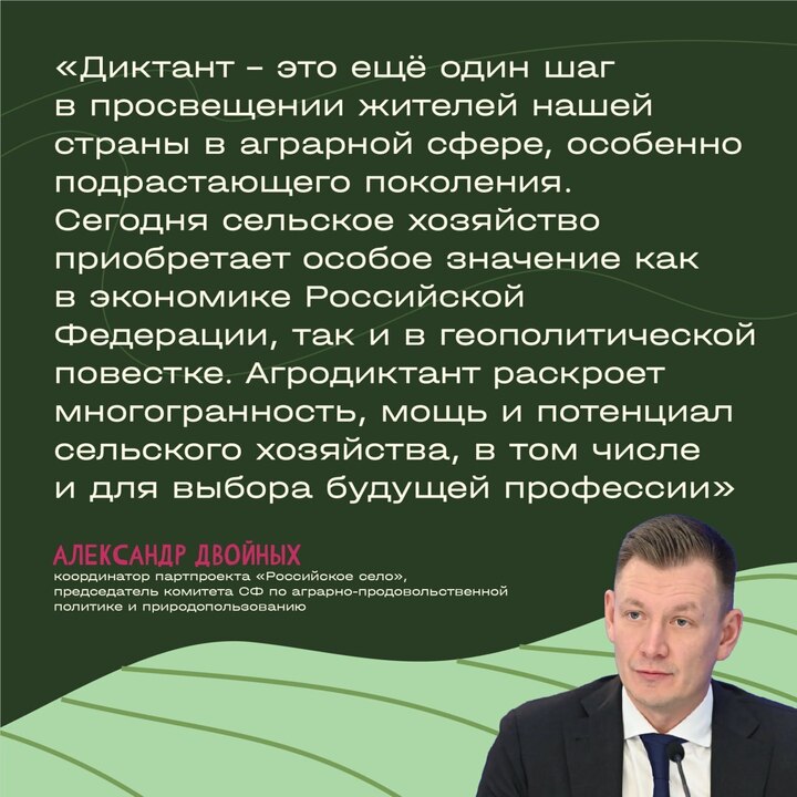 Всероссийская акция АГРОДИКТАНТ пройдёт с 8 по 12 октября на площадках по всей стране — в школах, вузах, региональных отделениях Россельхозбанка, на предприятиях АПК и в культурных центрах. Также диктант можно написать онлайн на портале агродиктант.рф.