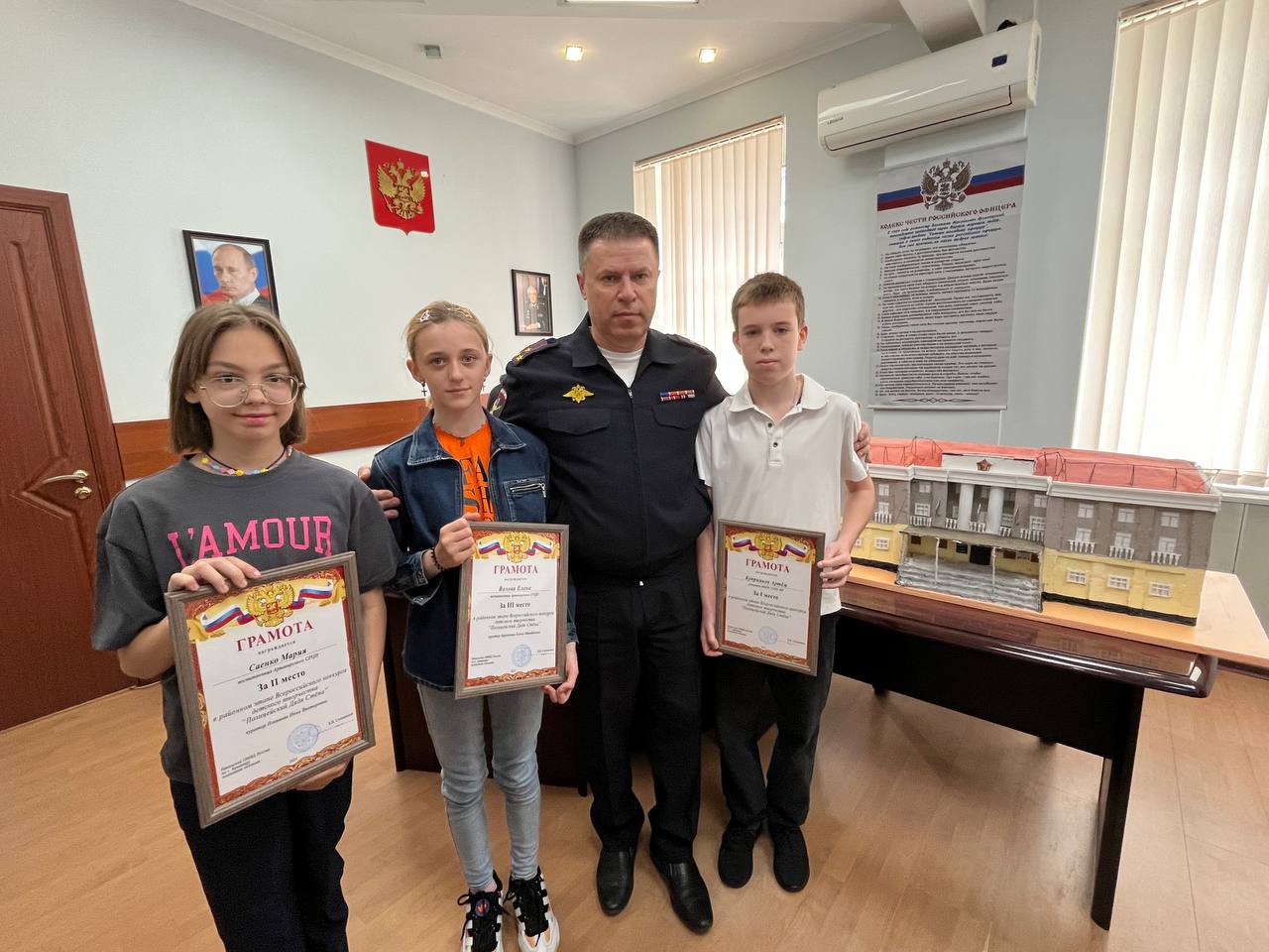 Победитель конкурса Артем Куприянов изготовил макет здания Армавирского Отдела полиции и подарил его начальнику ОМВД Ярославу Степаненко. Второе место заняла Мария Саенко. А на третьем оказалась Елена Волова.