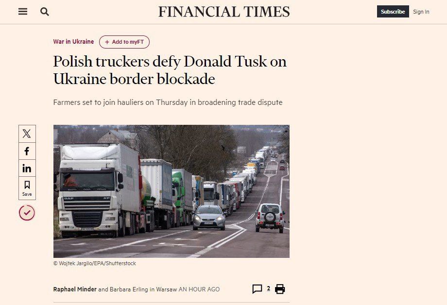 Дальнобойщики пообещали оставаться на месте до тех пор, пока ЕС не восстановит систему разрешений, которая ограничивала украинским грузовикам въезд на территорию блока. Но европейские чиновники отвергли идею возвращения квот, а Туск в этом споре встал на сторону Брюсселя, обращает внимание Financial Times.