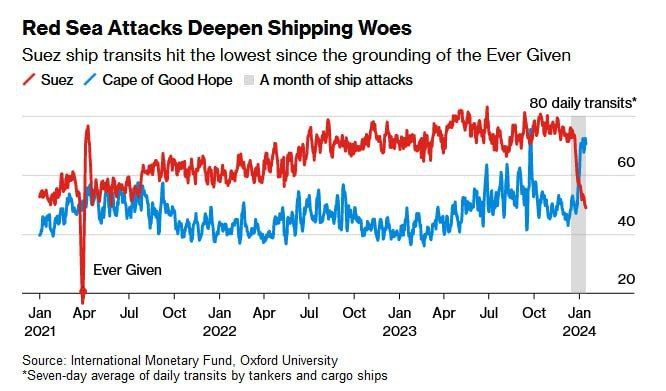 Транзит коммерческих судов через Суэцкий канал упал до самого низкого уровня с 2021 года.