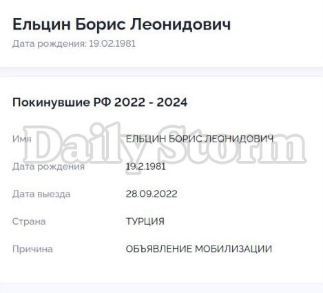 Речь идёт о базе, где собрана информация о гражданах России, которые якобы уехали из страны по разным основаниям (то из-за начала СВО, то из-за частичной мобилизации). Теперь в этой базе появилась карточка Бориса Ельцина-младшего – внука экс-президента. В "личном деле" указано, что из России в Турцию он уехал 28 сентября 2022 года.