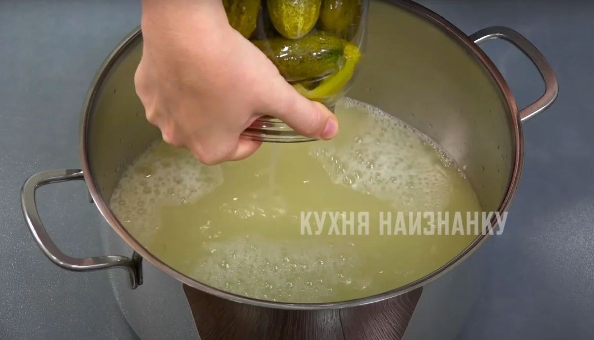 У меня в этот раз огурцы квасились трое суток. Они уже вкусные и хрустящие. Но это еще совсем не то, что нужно)) Сливаю рассол в кастрюлю, ставлю кастрюлю на плиту и довожу рассол до кипения. Кипячу 6-7 минут.
