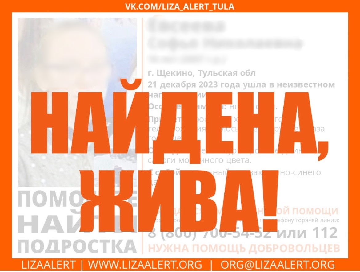 В Тульской области нашли живой девочку-подростка, пропавшую в Щекине. Ее местонахождение было неизвестно с 21 декабря 2023 года.